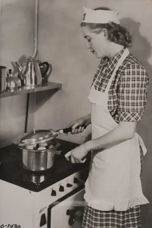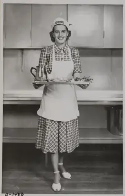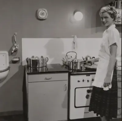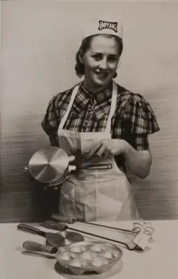 Høyang-piken demonstrerer kjøkkentøy, 1952. Foto: Vestfoldmuseenes fotosamling.