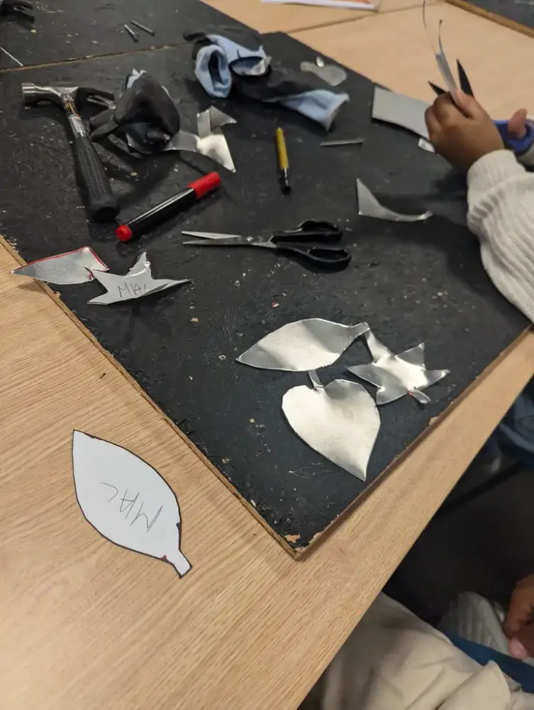 På dette verkstedet skal vi bli bedre kjent med materiale aluminium. Vi gjenbruker skrapmetall fra fabrikken i Holmestrand for å lage små pyntehus.
