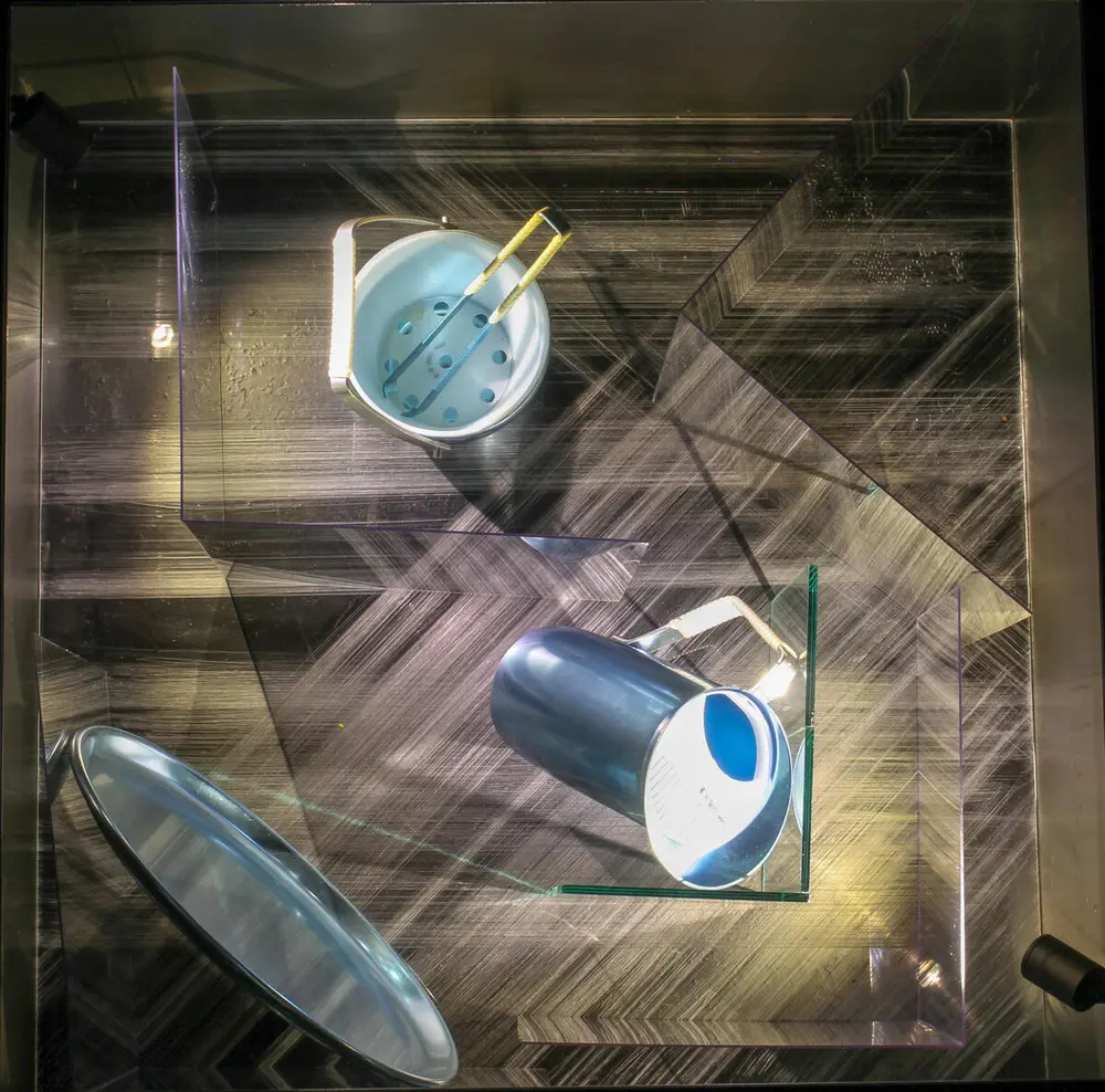 Consisting of a jug, ice bucket, tongs, and serving tray, this stylish set represents a cool elegance and a social status far removed from the prosaic juicers and fish pans which dominated the product range just a few years earlier. Both the underlying design process, as well as the design culture of which the bar set and similar products became part, thus contributed to transforming the meaning of the material.