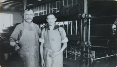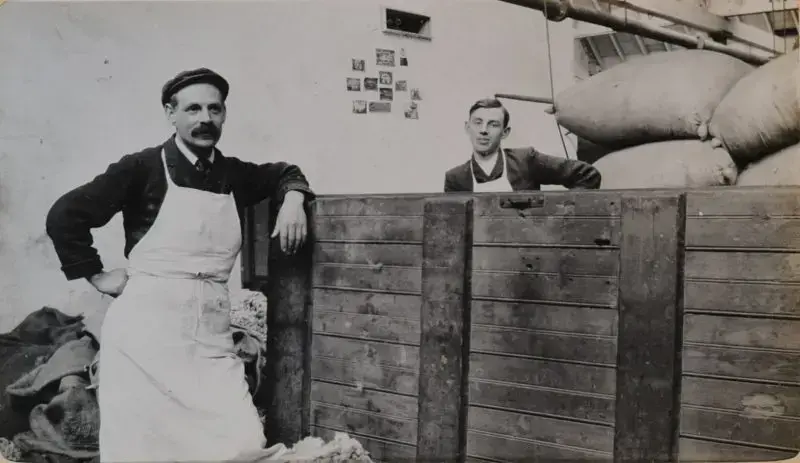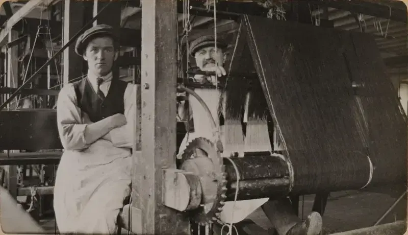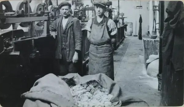 Bildene er fra forarbeidet av ull, karding og prøveveving av stoffer. Her har altså senere fabrikkeier Jebsen tatt bilder av arbeidere i arbeidstøy ved maskinene. Jørg Jebsen kan fortelle at hans onkel nok var lærling ved denne fabrikken i en periode.