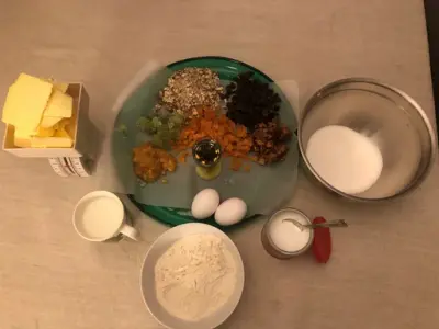 Råvarer til English Plum Pudding etter Jane Bullens oppskrift. Foto: Hanne S. Østerud.