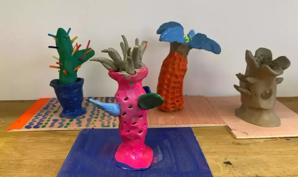 Inspirert av utstillingens ulike objekter lar vi oss inspirere til å utforske form, farge og geometriske mønstre med maling og leire.