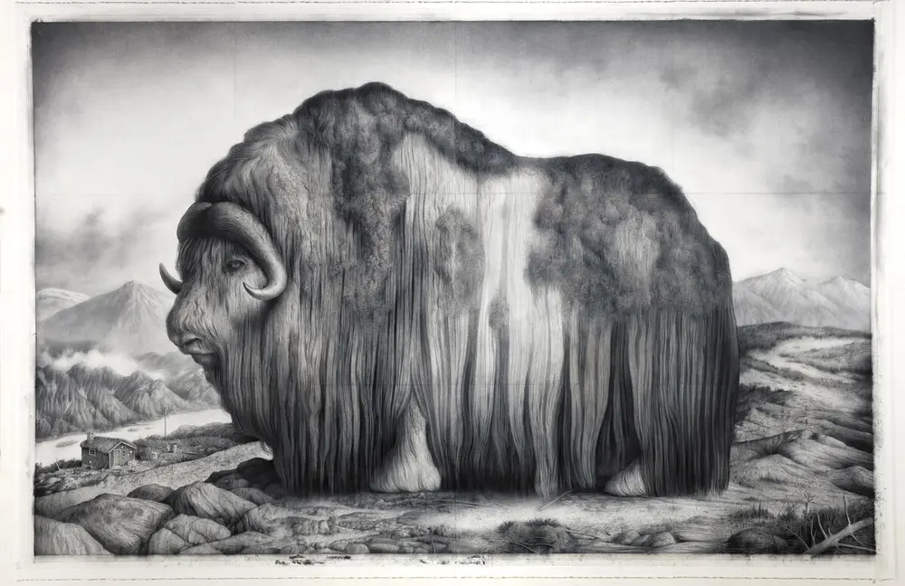 The question is often posed to the receptionist at Haugar Art Museum and refers to Sverre Malling's iconic work Norwegian Muskox from 2016. The answer is February 2023 - in an exhibition with works on paper from the collection.