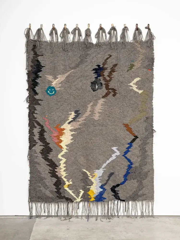 Ann Cathrin November Høibo, Hvis verden spør, så er svaret nei #1, 2020 Fire paneler: håndvevd ull, bomull, rayon, tyll, keramiske kroker og tre. Som vist: 231 x 1040 x 9 cm. Med tillatelse fra kunstneren og STANDARD (OSLO), Oslo. Foto: Vegard Kleven - 2/3
