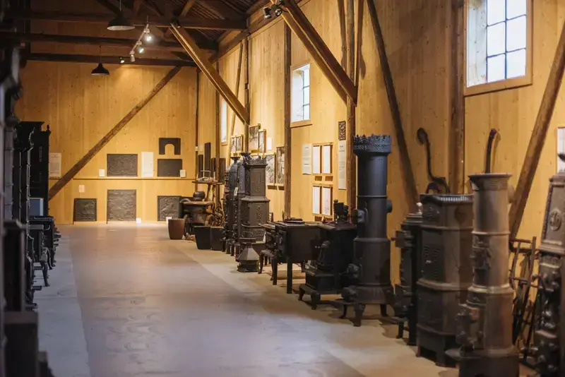 Fra Eidsfoss jernverksmuseums utstilling. Her kan du blant annet se en flott samling av støpejernsovner fra Eidsfoss jernverks produksjon, fra 1750 til 1960.
