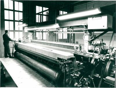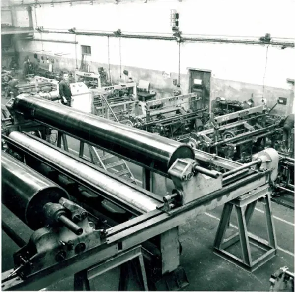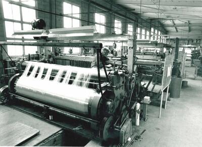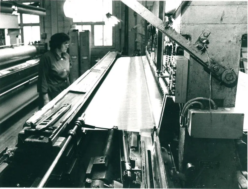 Bilder over: Stor produksjon: Vire og Metalldukfabrikken AS på Eidsfoss, ca. 1970. Foto: Tilhører AS Eidsfos Verk.