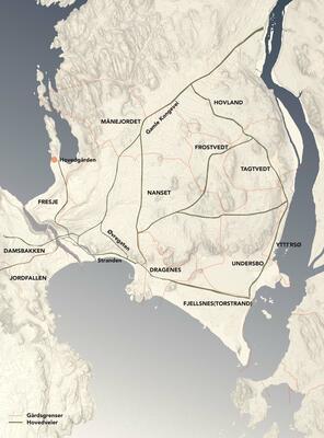 Gamle gårdsgrenser og veier i Larviksområdet. Grunnlag: Britt S. Mathisen, Larvik kommune, Gro Stalsberg og Aina Aske, Larvik Museum. Rekonstruksjon: Fritz Halvorsen Arkitektur AB. - 2/3