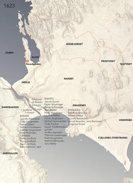 Innbyggere i Larviksområdet etter skjøtet fra 1623. Grunnlag: Britt S. Mathisen, Larvik kommune, Gro Stalsberg og Aina Aske, Larvik Museum. Rekonstruksjon: Fritz Halvorsen Arkitektur AB - 3/3