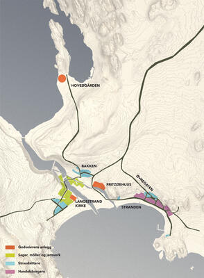 Situasjonen i Larvik i 1660-årene. De mørke linjene markerer veifar og rideveier. Grunnlag: Britt S. Mathisen, Larvik kommune, Gro Stalsberg og Aina Aske, Larvik Museum. Rekonstruksjon: Fritz Halvorsen Arkitektur AB
