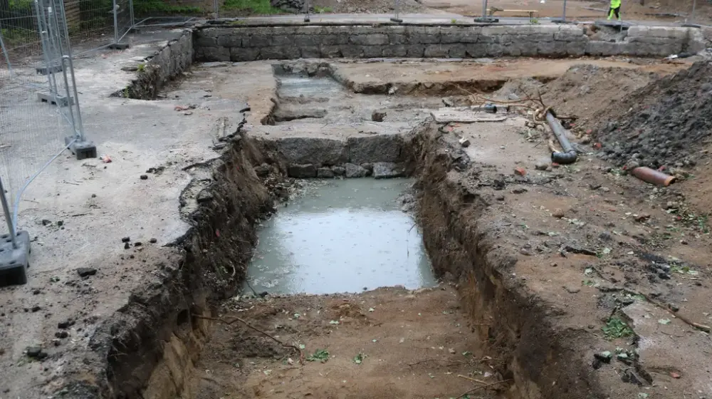 Dam under utgraving: en mur i retning vest-øst bryter tvers over den blottlagte delen av dammen. - 2/2