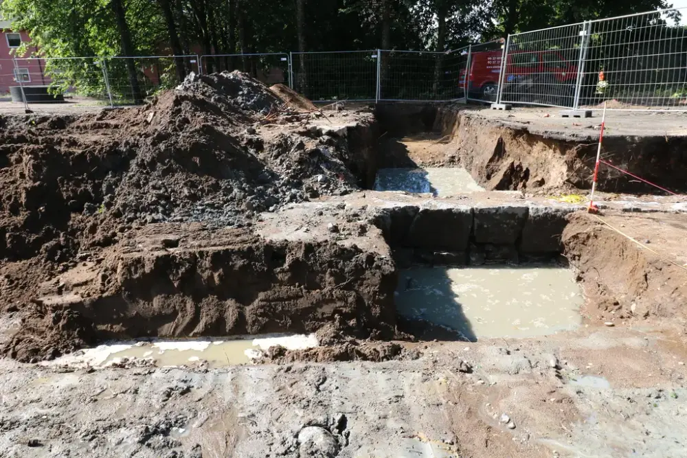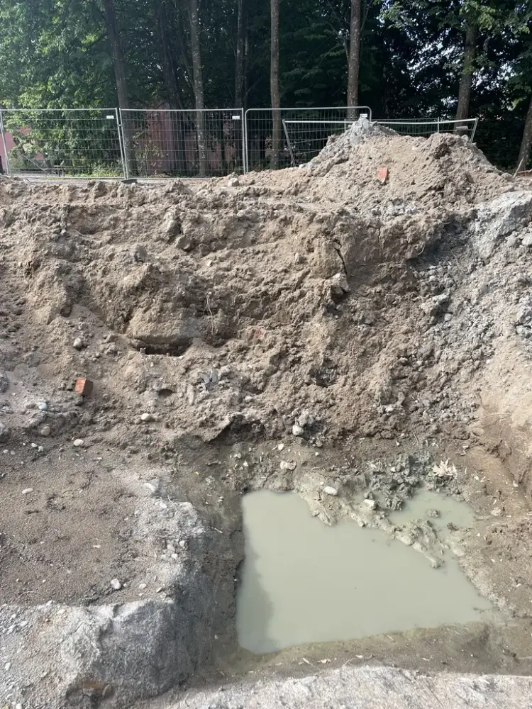 Under massene lengst inn i hjørnet av denne rivegropa dukket karpedammen opp i 2024.