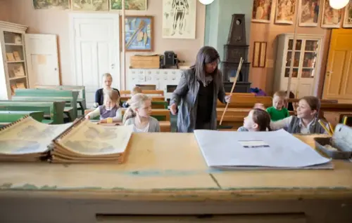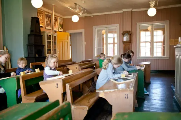 Kl. 12.00: En gammeldags skoletime: Bli med på en gammeldags skoletime i Herregårdens skolestue. Her kan du få se på de spennende tingene som læreren har gjemt inni skapene, og oppleve hvordan en skoledag kunne arte seg for mer enn hundre år siden.