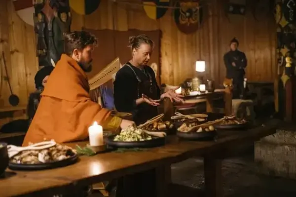 Husfrua på Borre gjør i stand til jul i den staselige hallen, og ønsker deg hjertelig velkommen 1200 år tilbake i tid, som gjest på et ekte julegilde!