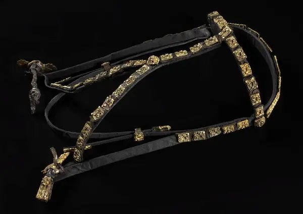 De flotteste gjenstandene fra Skipshaugen stammer fra flere sett med rideutstyr, til minst tre hester. Blant gjenstandene var det små beslag til seletøy i forgylt bronse, et flott selehøvrebeslag i forgylt bronse og rester av en dekorert sal. I tillegg ble det funnet et trestykke med forgylte bronsebeslag som vi ikke vet formålet med. Alle gjenstandene av bronse var dekorert i det som ble hetende Borrestil. Rideutstyr er funnet i både mannsgraver og kvinnegraver, og kan derfor ikke hjelpe til med å kjønnsbestemme graven. Imidlertid er det flere andre gjenstander som kan gi en indikasjon på kjønn.