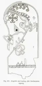 Tegningen over til høyre viser hvordan en av sengestolpene fra Oseberg så ut med malt dekor. Den er beskrevet slik: Bunnen er gulhvit, tegningene i svarte eller brunsvarte linjer og flater inne i figurene delvis lagt med kraftigere gult. Langs den krumme kanten av nakken på dyrehodet er det tegnet lokker inn over overflaten, dette viser at fargene er brukt som et supplement i utformingen av dyrehodet. På andre sengestolper er lokkene skåret inn i overflaten. Fra Osebergfundet bnd 3, s 234 (Omskrevet til moderne norsk).