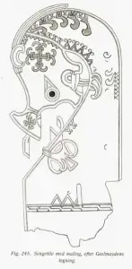 Detaljer fra Søyle 2. I midten ser vi en av krigerne til Halvdan den gavmilde og matille, som ifølge Snorre er gravlagt på Borre. Foto: Torstein Gamst. - 3/3