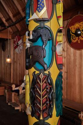 I Gildehallen på Borre er de fire søylene som omkranser hallrommets senter rikt dekorert med malte utskjæringer. Hallen og søylene er bare en mulig tolkning, men gir et inntrykk av hvordan en hall kan ha sett ut i yngre jernalder. Utskjæringer og malt dekor er velkjent fra yngre jernalder, både gjennom arkeologiske funn og bevarte skaldekvad. Fra Vestfold er kanskje de flotte utskjæringene fra Oseberg mest kjent. Mange av utskjæringene hadde også rester av maling da de ble funnet. Fargene har uheldigvis gått tapt, men tegninger viser hvordan fargene så ut da gjenstandene ble funnet.