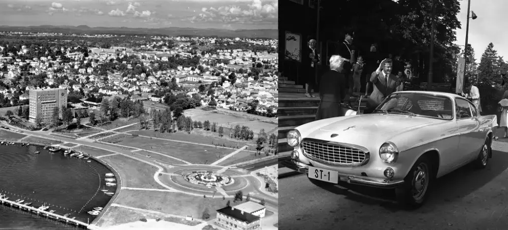 Bilde 1: Flyfoto over Sandefjord omtrent 1965. Fotograf ukjent, Hvalfangstmuseet/ Vestfoldmuseenes fotosamling. Bilde 2: Helgenen og hans Volvo P1800 utenfor Park Hotel. FOTO: Søren Emanuelsson