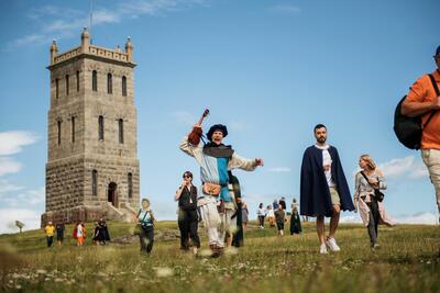 Bli med opp i Slottsfjelltårnet og kast steiner (vannballonger) mot fiender i anmarsj.