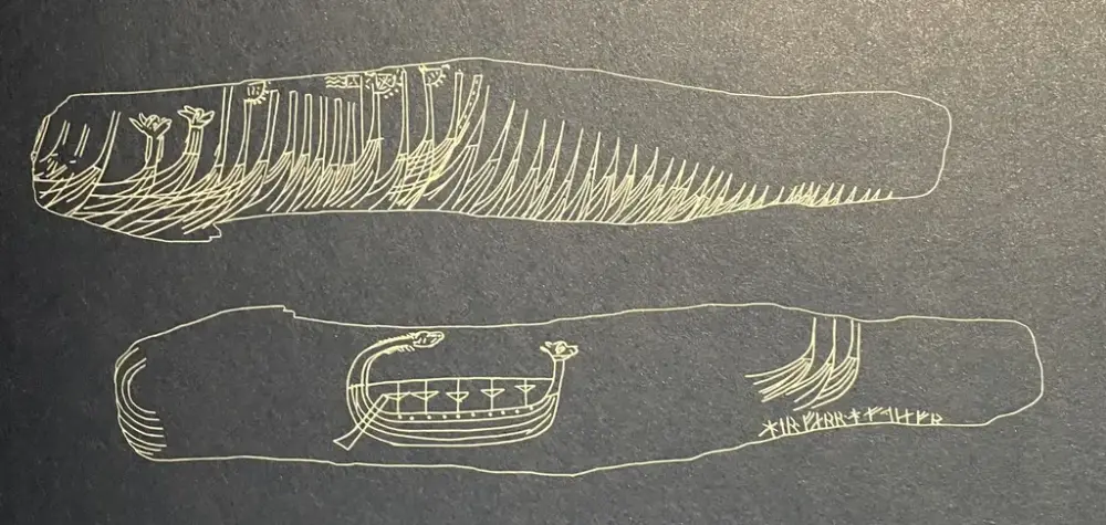 Tegning av runepinnen. Foto: Cecilia Gustavsen. «Her farer den havdjerve», lyder runene på pinnen.