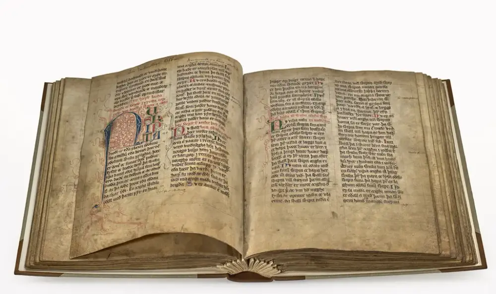 Et av landslovmanuskriptene som skal vises på Slottsfjellsmuseet med sirlig utførte lover. Foto: Den Arnamagnæanske Samling, Københavns Universitet.