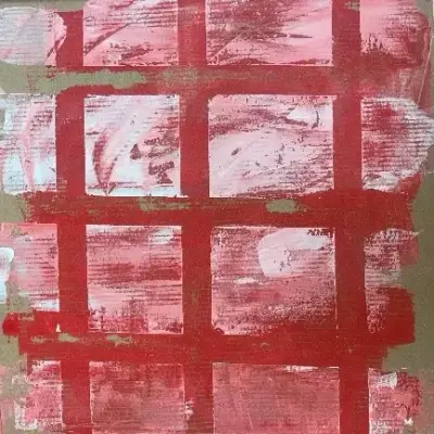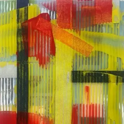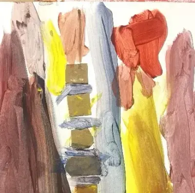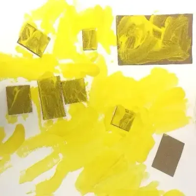 Inspirert av utstillingen utforsker vi et abstrakt billedspråk med ulike metoder som collage, papirtape, sjablonger og plastspatler på papp og andre restmaterialer fra museet.