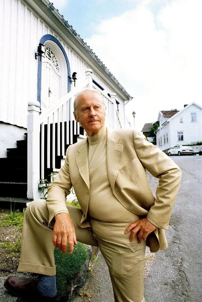Thor Heyerdahl utenfor sitt barndomshjem i Larvik.
