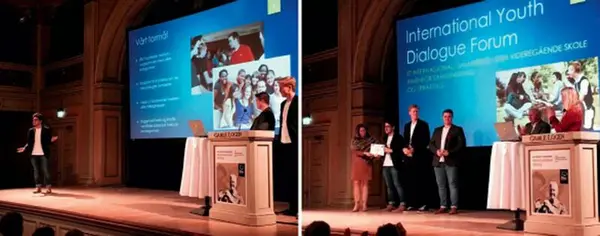 Til venstre, over: Vinnerne av The Thor Heyerdahl Scholarship 2016: ‘The International Youth Dialogue Forum’ – Et fremragende initiativ med fokus på å fremme dialog mellom unge voksne rundt om i verden om sentrale problemstillinger vedrørende vår planet. Til høyre: The International Youth Dialogue Forum (IYDF.no) Mottar førsteplassen i konkurransen om Thor Heyerdahl-stipendet 2016. Et stipend Heyerdahl-instituttet har gleden av å dele ut på vegne av regjeringen.