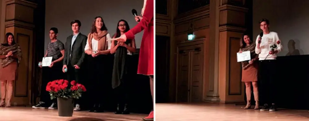 Til venstre, over: Andreplassen i konkurransen om stipendet gis til The International English Class/The Introduction Class fra Horten. Til høyre: Ludvig Vikan – en ung, talentfull filmskaper, mottar tredjeplassen. Han kommer til å nå langt!
