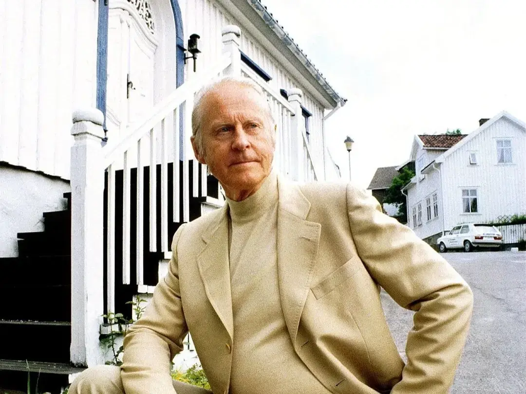 Thor Heyerdahl foran barndomshjemmet i Larvik. Østlands-Posten