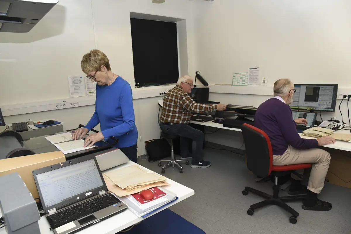 Frivillige fra Slekt og Data Vestfold på Vestfoldarkivets digitaliseringsrom. Mekonnen Wolday / Vestfoldarkivet