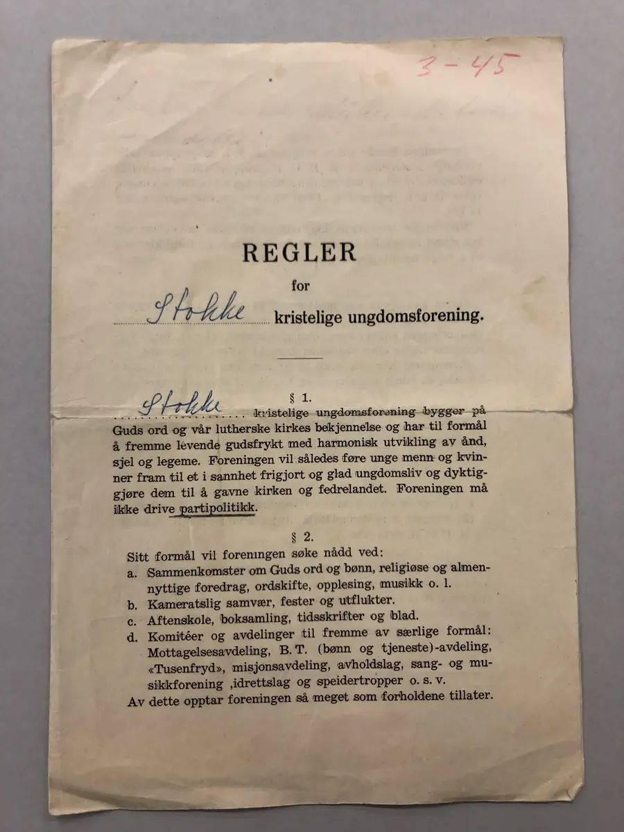 Stiftelsesmøtet startet med bønn og salmesang, ledet av prosten. Deretter leste han diktet «Et sognebud» av presten og salmedikteren M. B. Landstad. Det møtte over 50 personer som ble skrevet inn som medlemmer. Møtet, som ble holdt i prestegården, ble avsluttet med andakt ved Kapellan Feet. I formålsparagrafen kan vi lese at «Stokke kristelige ungdomsforening bygger på Guds ord og vår lutherske kirkes bekjennelse, og har til formål å fremme levende gudsfrykt med harmonisk utvikling av ånd, sjel og legeme».
