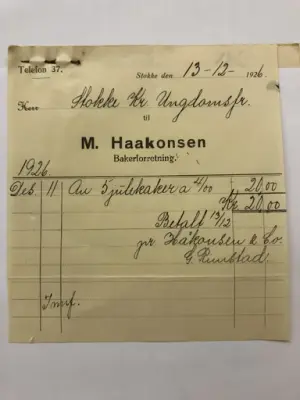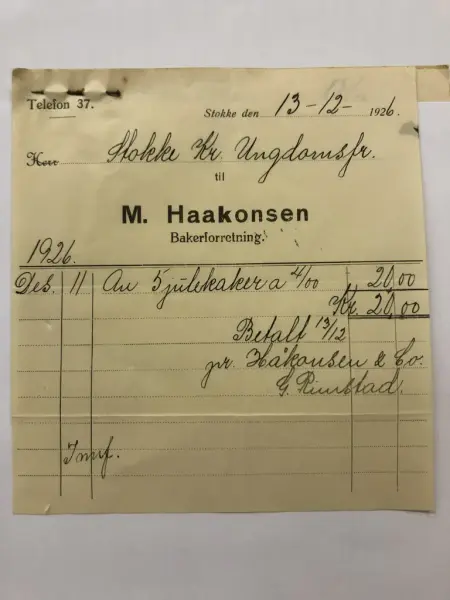 Kvittering på fem julekaker til 4 kroner stykke, til et møte i desember 1926. Fra arkivet etter Syforeningen Våren - 4/4