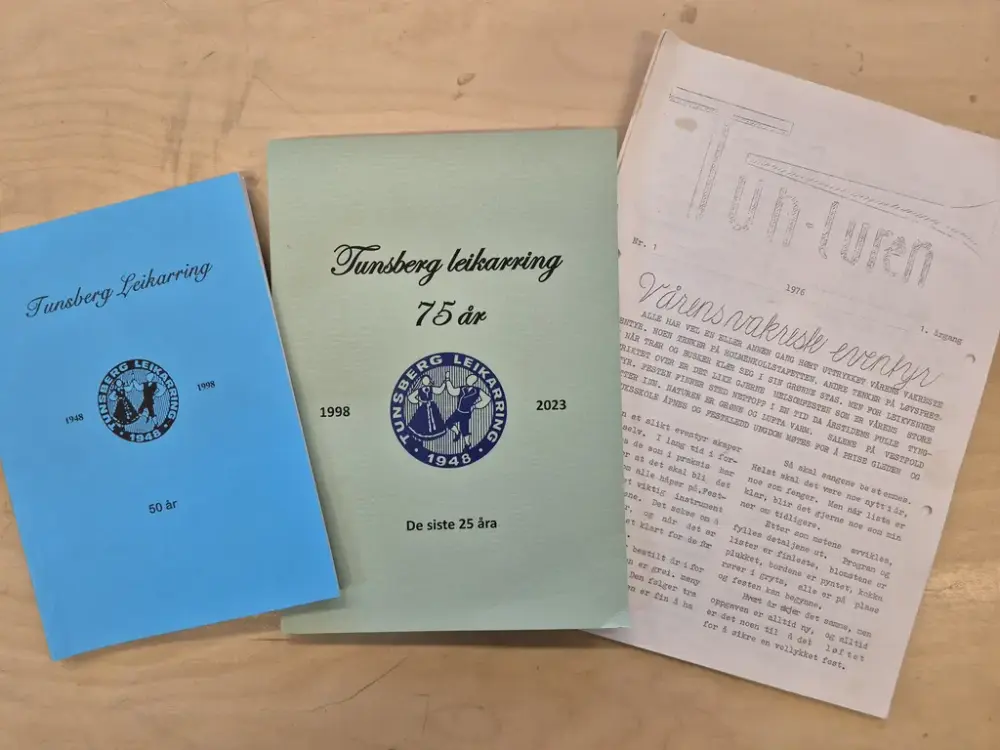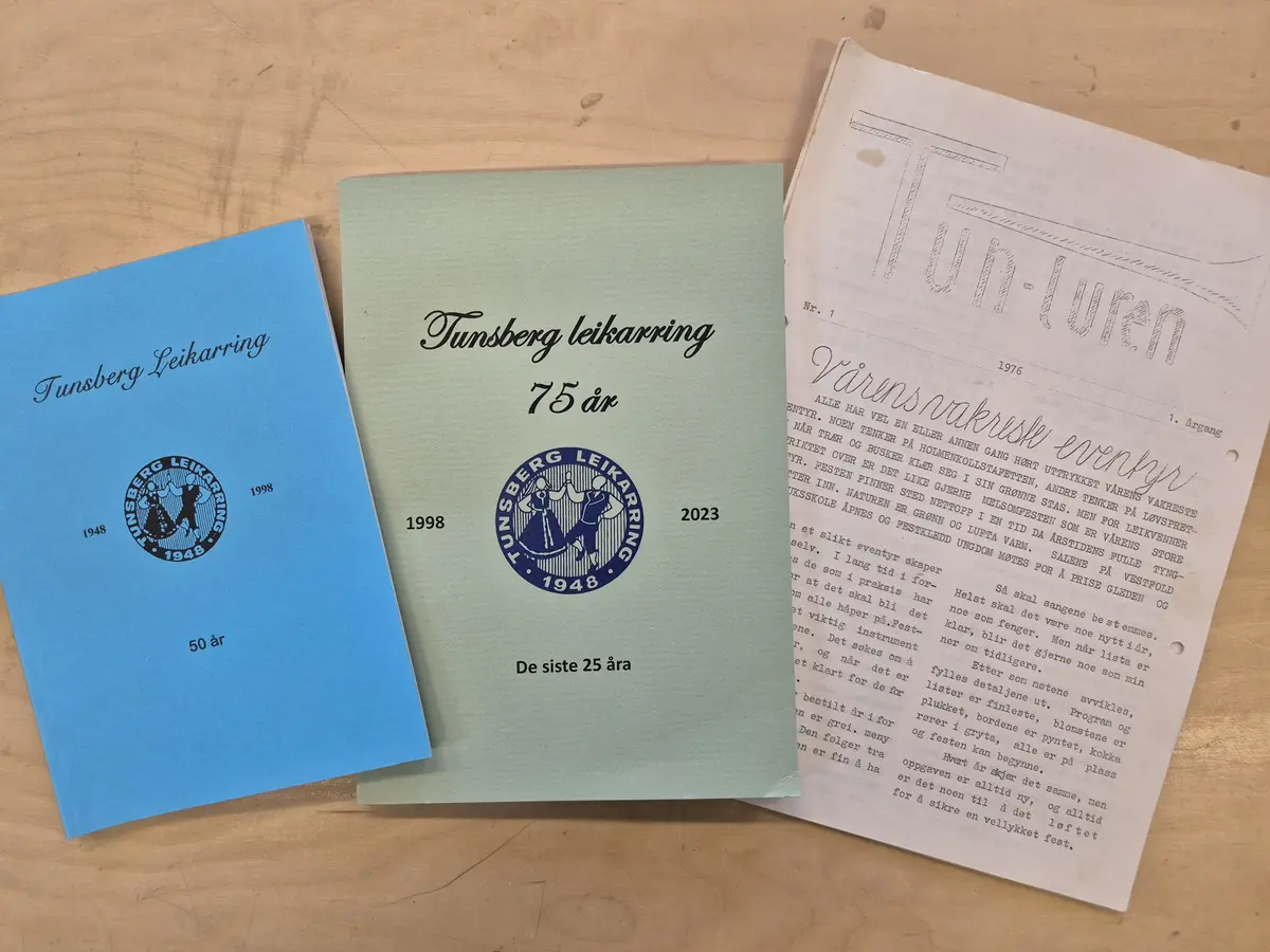 Tunsberg leikarring har gitt ut hefter med lagets historie, blant annet til 50-årsjubileet i 1998 og til 75-årsjubileet i 2023. Fra arkivet etter Tunsberg leikarring (A-3032).