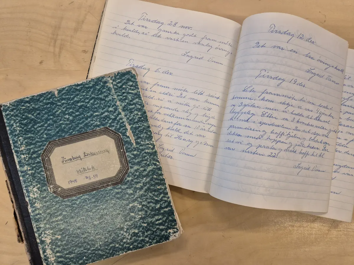 De første møteprotokollene, fra 1948 til ut på 1960-tallet. Fra arkivet etter Tunsberg leikarring (A3032).