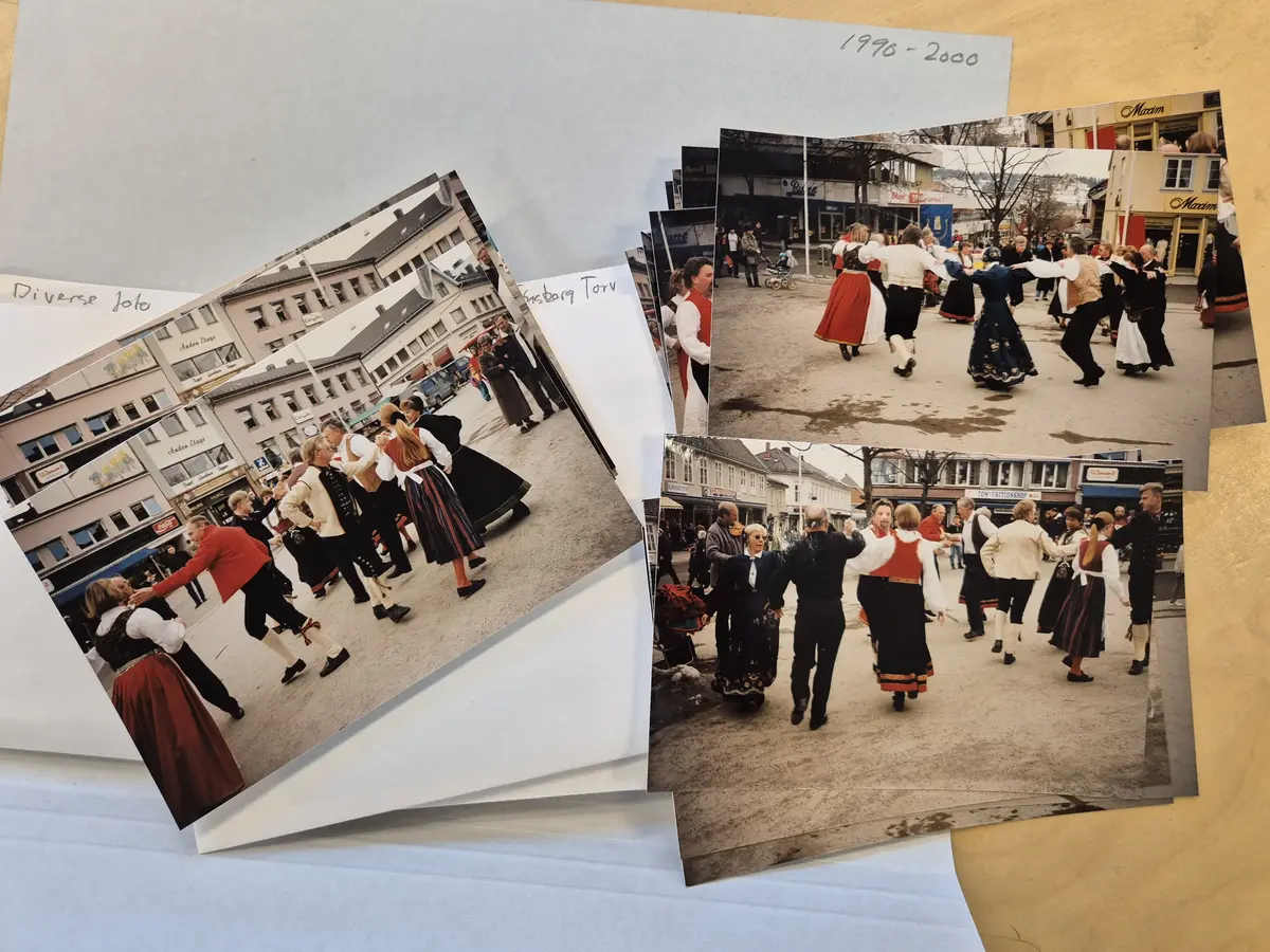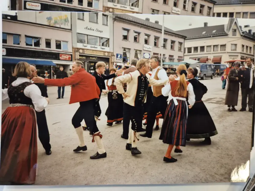 Folkedans på Torvet i Tønsberg: fra feiringen av Noregs Ungdomslags 100-årsjubileum i 1996. Ukjent fotograf. Fra arkivet etter Tunsberg leikarring (A-3032).